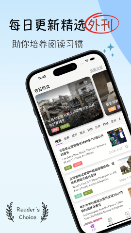 每日更新各种英文出版物的文章,涵盖尖端技术、社会热点、文化时尚等。内容来源包括《经济学人》《国家地理》等知名刊物,确保用户接触到最地道的英文表达。