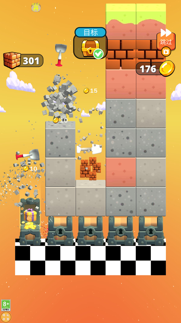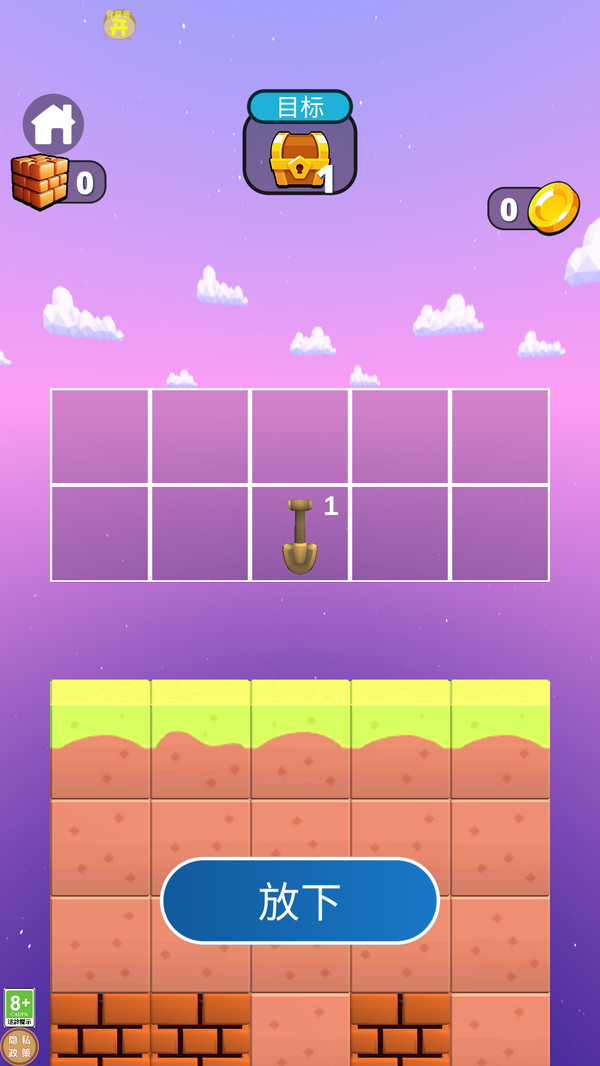 首先在游戏开始时需要仔细阅读并同意隐私政策,点击"同意并继续"即可进入游戏世界。游戏界面简洁明了,红色方框区域是主要操作区,点击"放下"按钮就能开始你的第一次挖掘体验。随着游戏进程推进,你会发现长按移动铲子可以触发特殊效果,让铲子合体变成更大的挖掘工具,大幅提升采矿效率。每当成功完成一个关卡,点击红色箭头指示的"继续"按钮就能进入下一关,开启新的冒险旅程。记得随时查看背包中的矿石储备,合理规划资源使用。