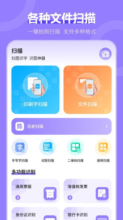 支持多种文件格式识别,包括PDF、JPG、PNG等常见格式,满足各类扫描需求。