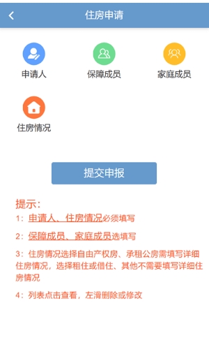 住房申请功能设计科学合理,申请人需要如实填写保障成员组成、家庭成员信息以及现有住房情况等核心内容。系统会根据用户填写的信息自动匹配适合的保障政策,并提供智能化的填报指导。对于家庭成员信息,平台提供灵活的选择填写方式,既保证了信息的完整性,又兼顾了用户的使用便利性。
