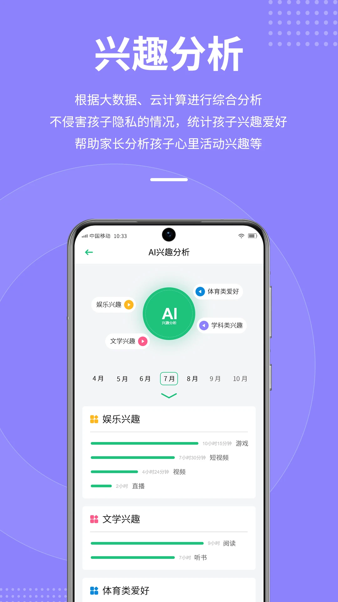 AI兴趣分析:通过大数据分析孩子的娱乐、学习偏好,生成个性化报告,帮助家长更懂孩子。