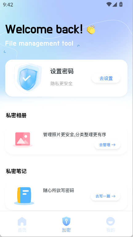 进入应用后,点击打开加密板块,进入文件加密管理页面。在加密设置界面,用户可以根据需求选择不同类型的加密方式,确保文件安全。在界面中选择设置密码选项,进入密码设定步骤。系统会提示设置6位以上的数字密码,并支持指纹或面部识别等生物识别方式。按照提示输入数字密码并确认保存,即可完成加密功能的设置。设置完成后,重要文件将获得双重保护,有效防止隐私泄露。