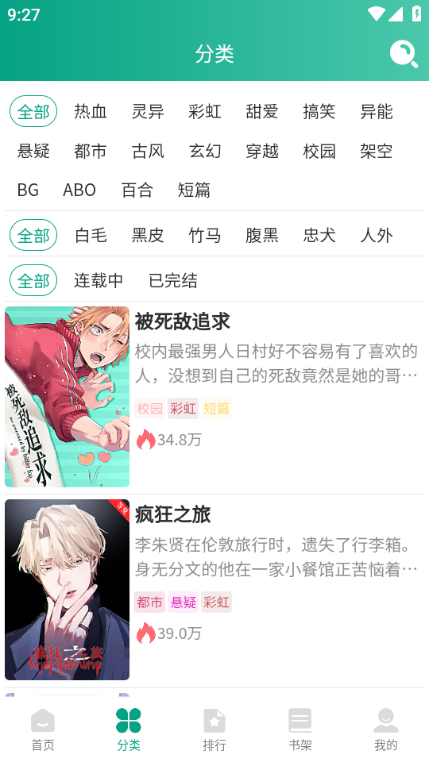 类型丰富:拥有丰富多样的漫画类型,包括爱情、冒险、悬疑、恐怖、科幻等等。可以根据自己的喜好选择不同的漫画类型进行阅读,满足不同用户的阅读需求。特别增设了耽美专区,收录了大量精品BL作品。