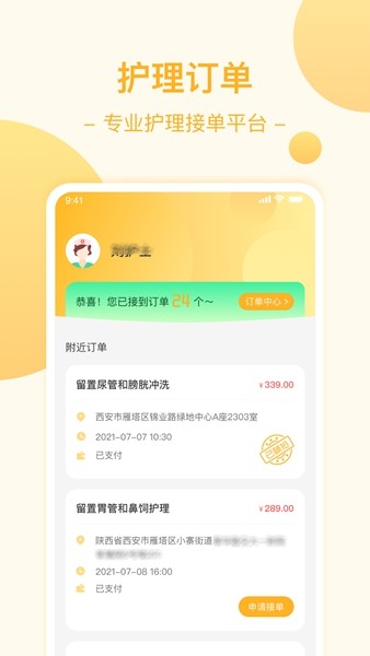 申请接单 简洁的接单流程设计,一键响应护理需求。系统自动审核资质匹配度,通过后即时建立服务关系。历史接单数据可视化展示,便于优化服务策略。