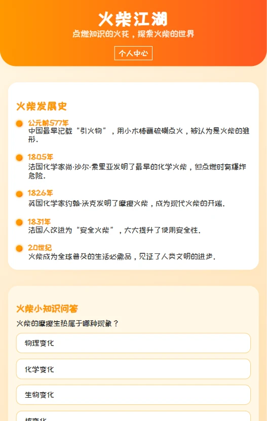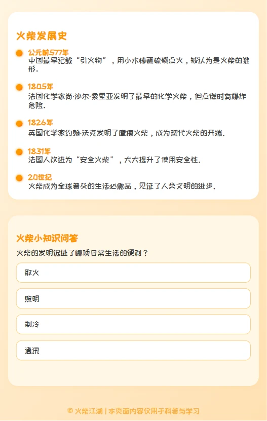 火柴江湖带你深入了解火柴的历史、制作工艺与科学原理。从古老的火镰到现代安全火柴,从磷的化学反应到火柴盒艺术,通过答题互动的方式,发现这方寸之间的科学与文化魅力。