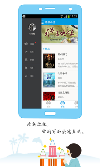 书城栏目:这里提供了精品、免费、男频、女频、出版等多种小说供用户选择。每周还会推出专题推荐和限时特惠活动,让用户发现更多优质内容。