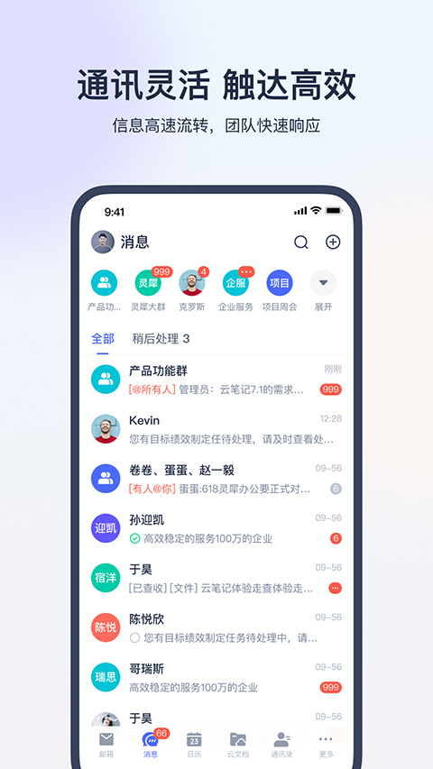 【通讯灵活,触达高效】将办公中使用率极高的在线文档、云盘、邮件与即时沟通打通,使信息高速流转,团队快速响应,极大地提升了协作效率。支持消息已读未读状态显示和@提醒功能,确保重要信息不被遗漏。