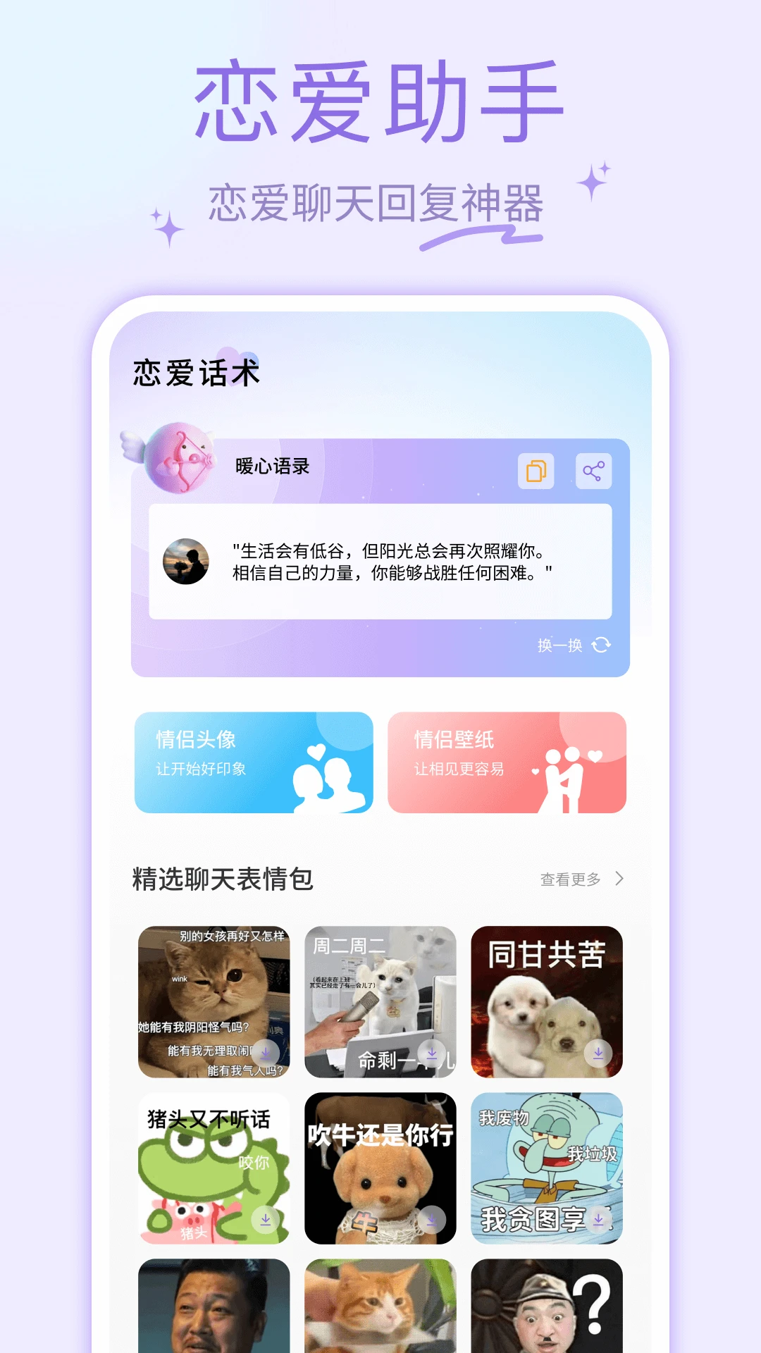 这款APP集合了各种聊天技巧,旨在帮助用户在恋爱或社交场合中更加自信的表达自己,和其他人建立起紧密联系。让你成为聊天达人,聊天氛围拉爆,快来加入进来吧!