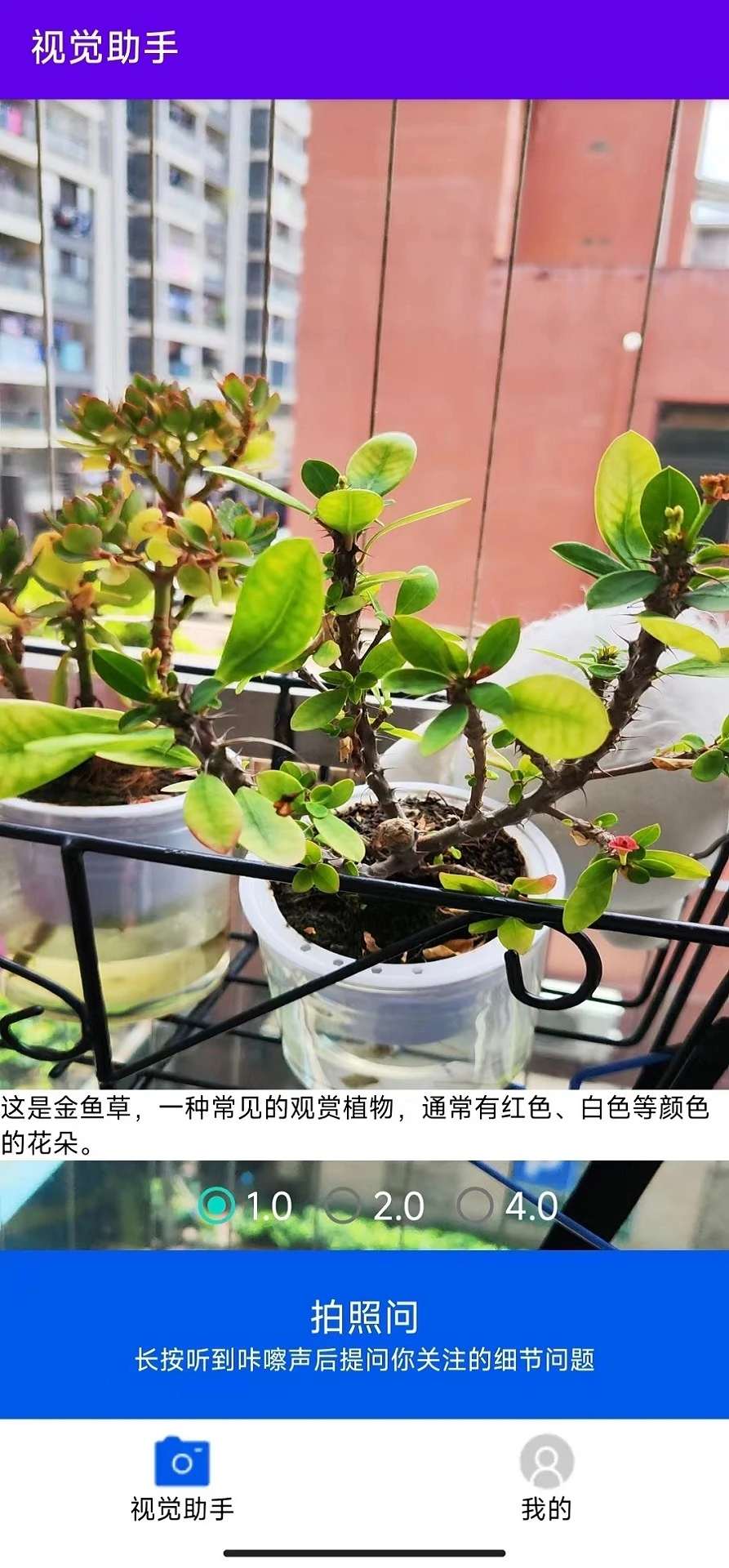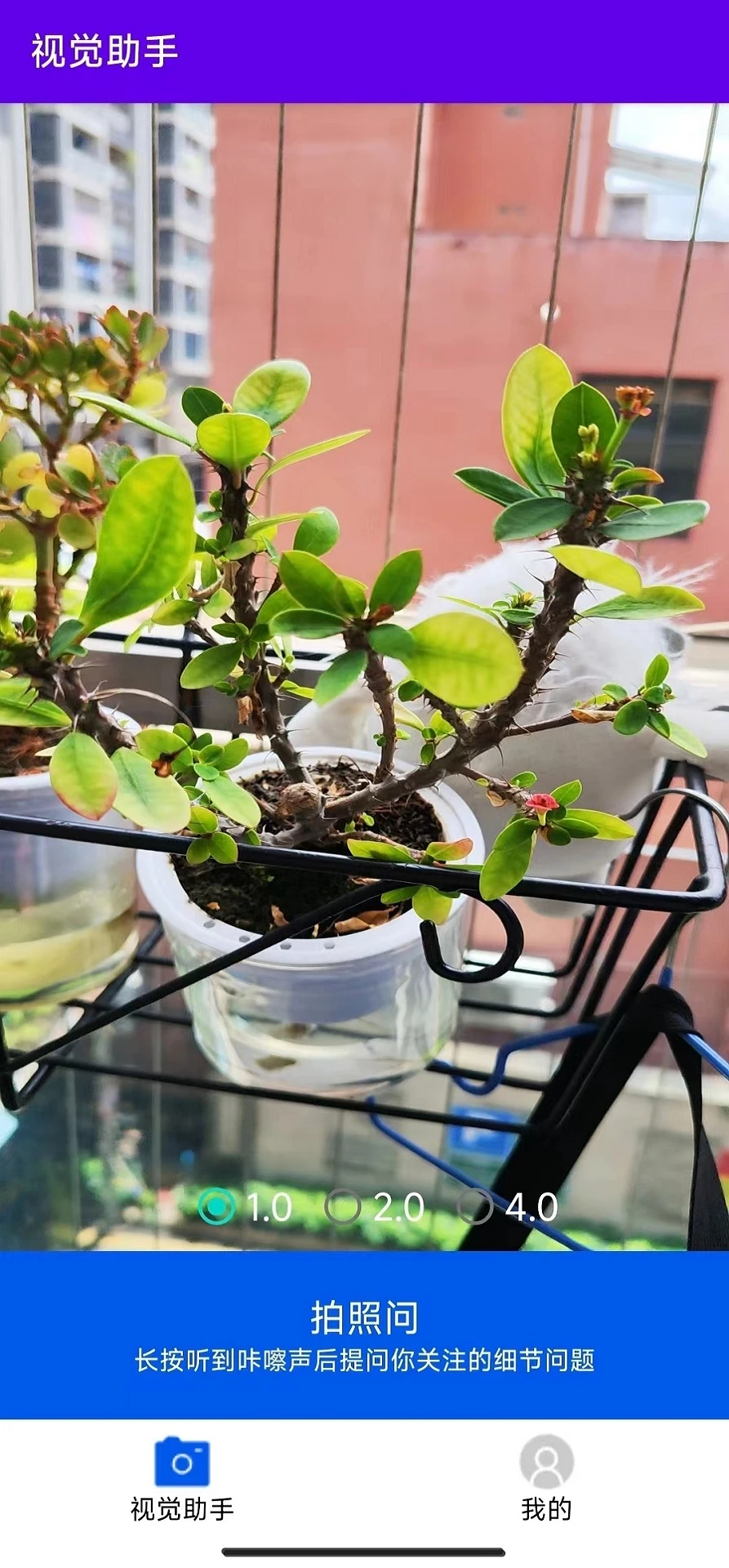视觉助手(英文名:VisionHelper)是一款应用程序,旨在为视觉障碍用户提供帮助。通过集成通用人工智能大模型技术的图像理解和识别、语音识别、文本转语音等技术,视觉助手能够协助用户识别理解周围环境和物体,并将识别结果以语音形式反馈给用户,帮助盲人用很自然的语音对话的方式实现对周围环境、障碍物、文字信息、路名/店名、花花草草等的"看见理解"和风险感知,带来前所未有的全新体验和辅助。