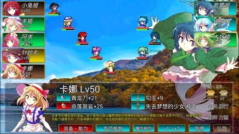 游戏中的攻击类型包括单体攻击、扩散攻击(影响横排)、贯通攻击(影响竖排)和全体攻击。提升角色好感度可以全面提高角色的体力、攻击、防御和敏捷属性。某些特殊刻印需要达到很高的好感度才能装备。部分角色(如风见幽香)在开店时,好感度提升可获得折扣优惠。