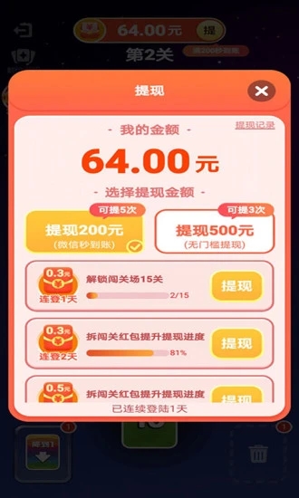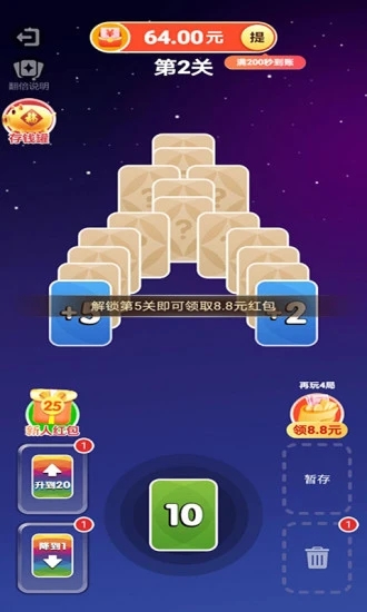 数字大冒险为每位新用户准备了丰厚的注册礼包,首次登录即可获得0.3元现金红包,而且支持秒速提现!游戏采用创新的关卡收益机制,每完成一个关卡约可获得0.3元收益,所有收益都能随时提现。特别值得一提的是,新用户注册即送58元超大现金红包,这样的福利在其他平台实属罕见。每日登录还能领取额外奖励,让您的收益源源不断。