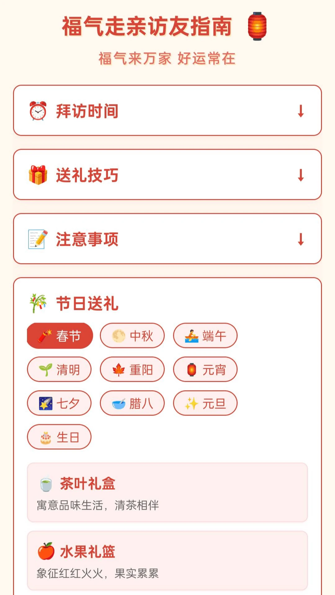 福气走亲访友指南提供全年节日送礼建议,覆盖传统与现代节日场景