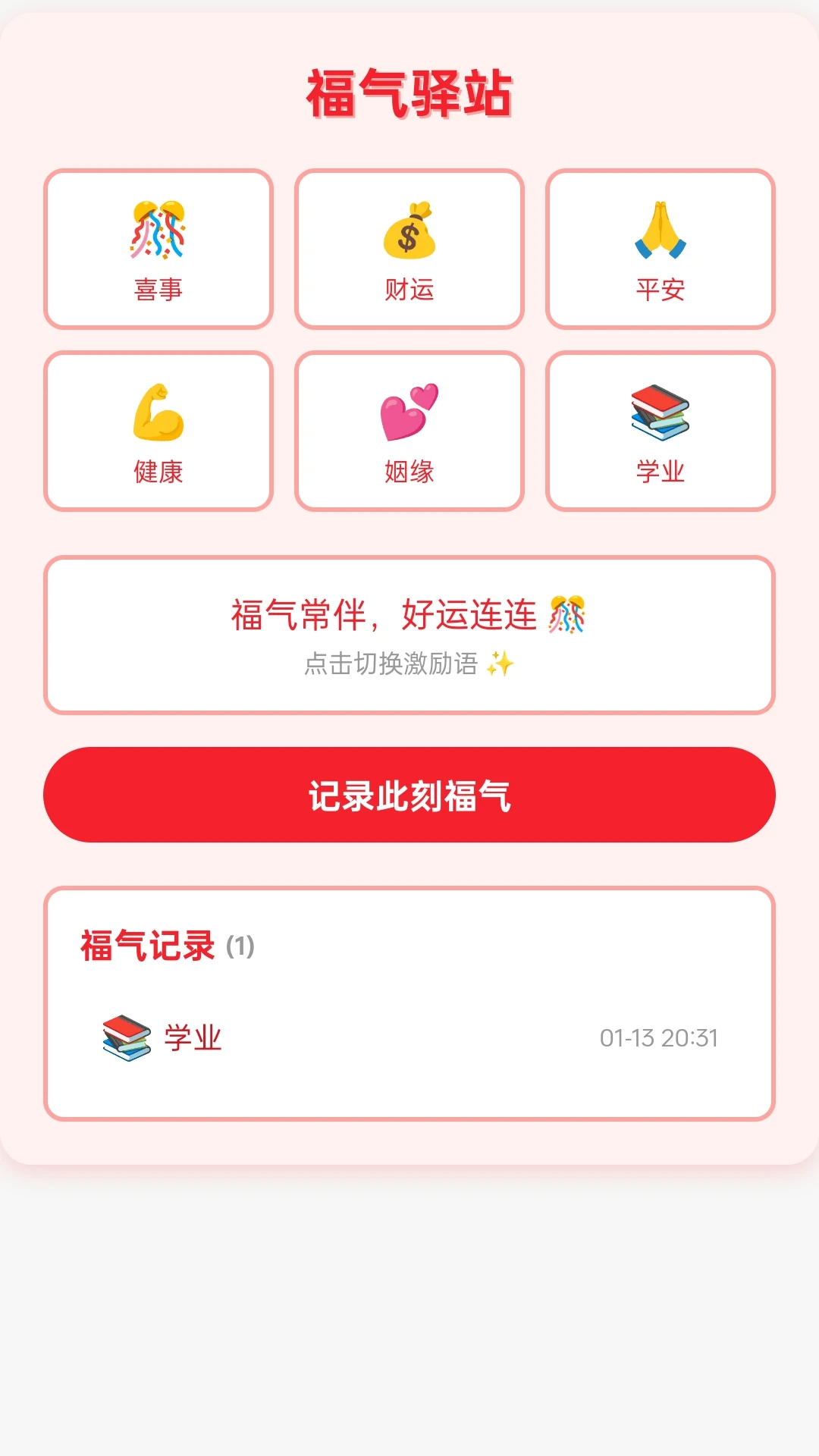 【福气驿站】福气的汇聚之地,设有喜事、财运、平安、健康、姻缘、学业等多种福气类别。您可以点击切换励志语,记录此刻福气。