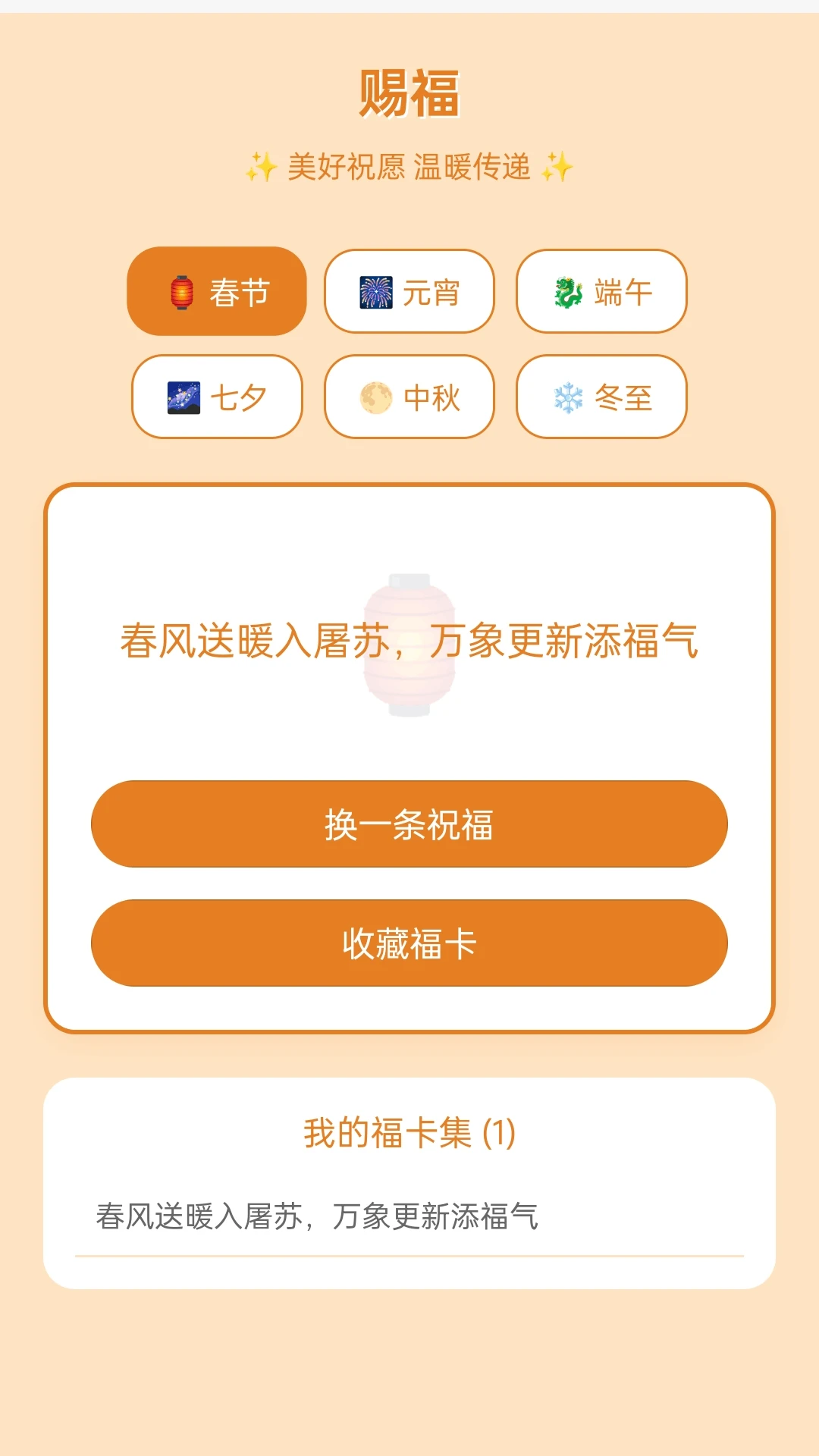 【福气传递】在不同的节日如春节、元宵、端午、七夕、中秋、冬至等,都可以为亲友送上专属祝福,让您的祝福有迹可循,传递温暖与福气。