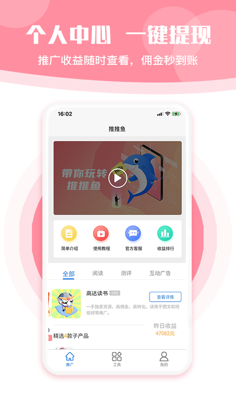 推推鱼App拥有简洁明了的个人中心界面,用户可以随时查看收益明细,支持一键提现功能,让您的每一分收益都能快速到账。平台采用先进的支付系统,确保佣金秒到账,让您享受无忧的收益体验。