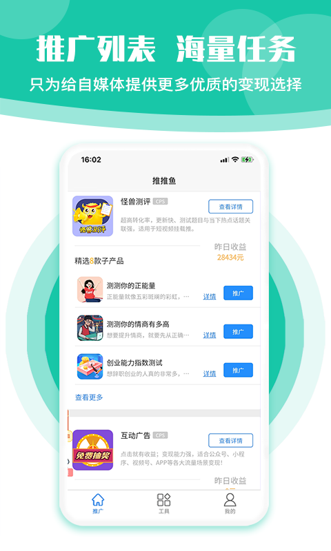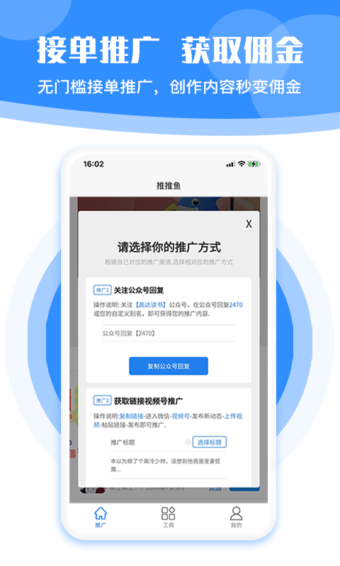 平台提供丰富的接单推广机会,用户可以通过完成推广任务轻松获取佣金。推推鱼采用无门槛接单机制,无论您是资深自媒体人还是刚入行的新手,都能在这里找到适合自己的推广任务,让优质内容快速变现。