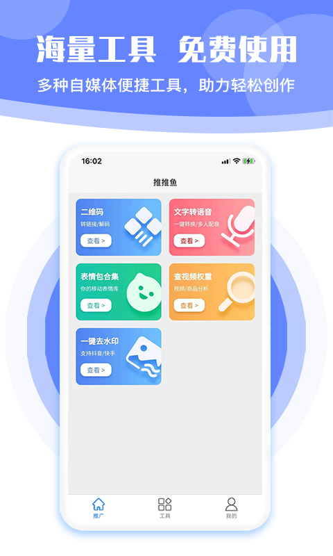 推推鱼汇集了海量实用的自媒体工具,全部免费提供给用户使用。从内容创作到后期处理,从数据分析到效果优化,平台提供多种便捷工具,帮助自媒体人提升创作效率,打造更优质的内容。