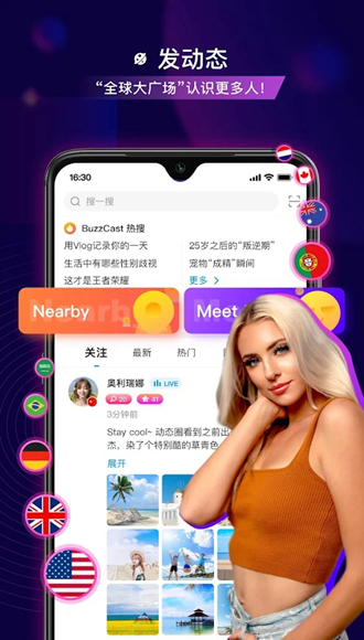 BuzzCast是一款充满活力的全球直播交友平台,前身为FaceCast,现已升级为更强大的社交娱乐空间。在这里,您可以结识来自世界各地的年轻、时尚、充满活力的新朋友,通过互相关注建立深度连接,享受无限畅聊的乐趣。平台不仅提供丰富的社交功能,还内置了多款趣味互动小游戏,让您轻松赚取金币的同时,与好友共同体验游戏的快乐,快速拉近彼此距离。独特的全球广场功能让您随时刷到来自五湖四海的精彩动态,发现更多有趣的内容和志同道合的伙伴。