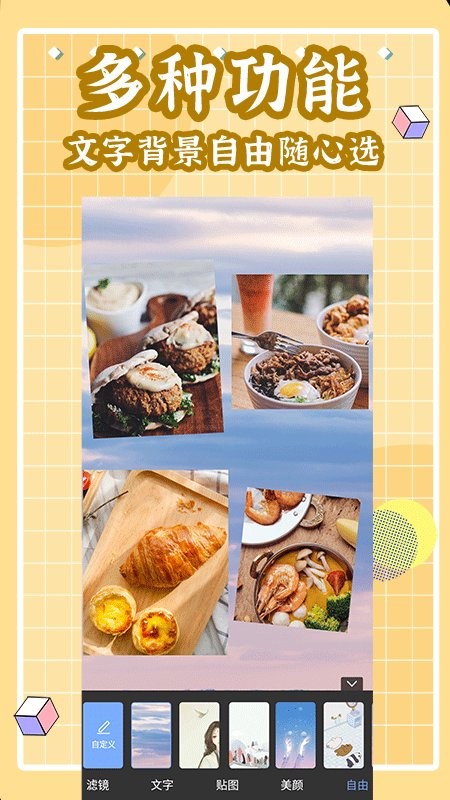 保存高清拼图,分享至朋友圈、微博、ins等各类社交平台,轻松展示你的创意作品!海量布局样式模板可供选择,还能自定义网格大小,边框粗细,和背景样式,简单易操作,拼贴神助手。丰富的背景和贴纸资源库,可以打造软萌可爱的风格,也能创作时尚前卫的视觉作品。专业级滤镜效果能瞬间提升照片质感,让你的每张照片都像时尚大片般精致。此外,软件还支持实时预览功能,确保每次调整都能达到理想效果。