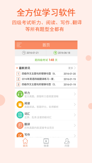新增2016年6月的听力、阅读、写作和翻译最新试题,让您的备考资料更加全面。现在就来下载APP,开始您的四级备考之旅吧!