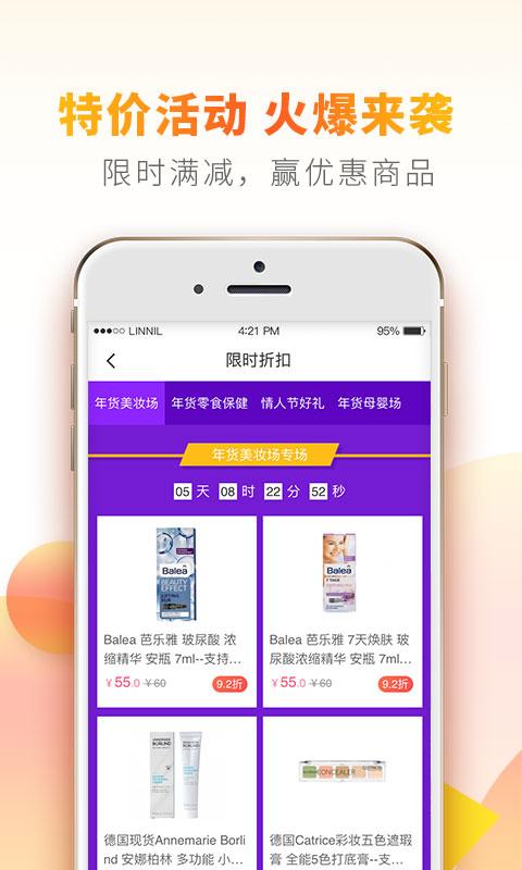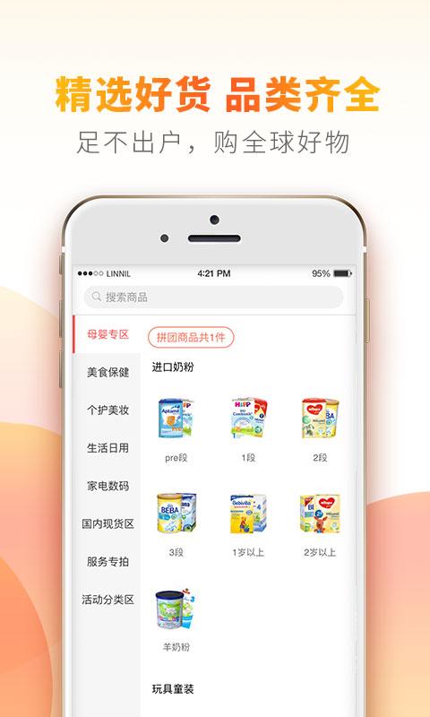 平台汇聚全球优质商品,精选海外正品,让您轻松实现一键购遍全球的愿望。我们拥有完善的海外仓储系统,全天候为您服务,国际供应链全程可追踪。商品品类丰富多样,包括德国奶粉、日本彩妆护肤、欧美个人洗护用品、国际大牌服饰鞋包、进口家居日用品、保健食品、母婴用品以及数码电器等。平台还会根据用户评价和购买数据,为您推荐超值洋货,让您知道什么最值得买!