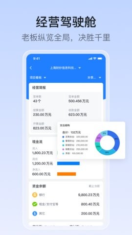 通过经营驾驶舱功能,用户可以全面查看企业经营数据,包括收入、支出、利润等关键指标。这些数据以图表形式直观展示,帮助管理层快速把握企业经营状况。