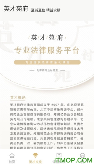 英才苑府成立于2007年,由北京英苑管理咨询有限公司、北京中建博雅咨询中心、郑州英苑企业管理咨询有限公司和郑州亿豪会议会展服务有限公司共同组成。公司总部设在北京,下设课题策划部负责市场调研和课题研发,网络运营部提供云课程技术开发和运营支持。郑州分部设有课程顾问部负责课程营销推广,会员部提供一对一会员服务。此外,公司还设有专业的培训部门负责员工培训,以及会务接待部门负责学员接待工作。通过一体化的开发、营销和服务体系,英才苑府已经发展成为专业的高端法律服务平台,为法律从业者提供全方位的专业支持。