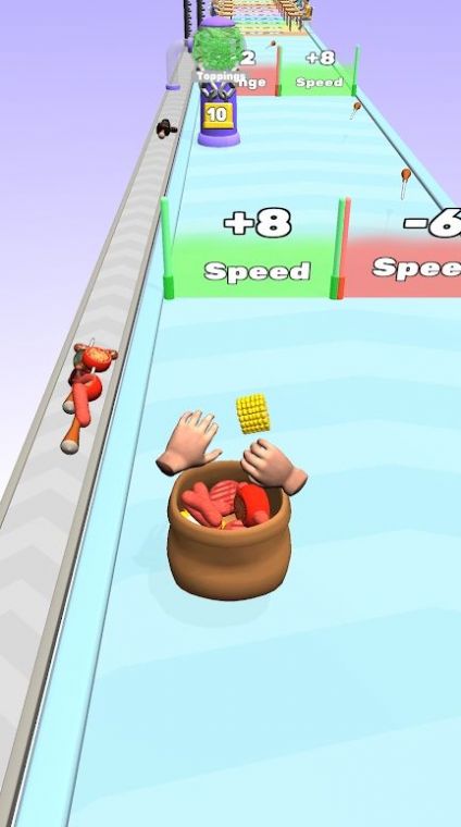 食材收集机制:各种食材会随机分布在跑道各处,烤架桶可以同时抓取多种食材。收集的食材数量不仅影响通关评分,还关系到后续解锁内容。这个机制鼓励玩家不断优化路线选择,在属性门选择和食材收集效率之间找到最佳平衡点。