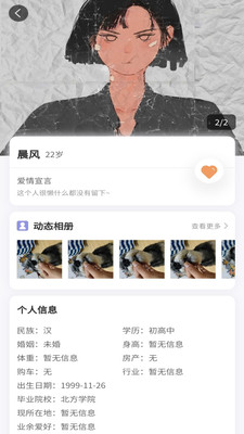 在这里交友,都可以随时去进行,找到兴趣好友;平台提供24小时在线服务,让您随时随地都能与心仪对象互动。进行同城交友匹配,都是十分的真实,交友更开心;系统会根据您的活动范围和兴趣爱好,推荐最适合的同城好友。让用户可以获取到更多的优质好友,实时告别单身。通过完善的用户资料展示和互动功能,帮助您深入了解潜在对象。
