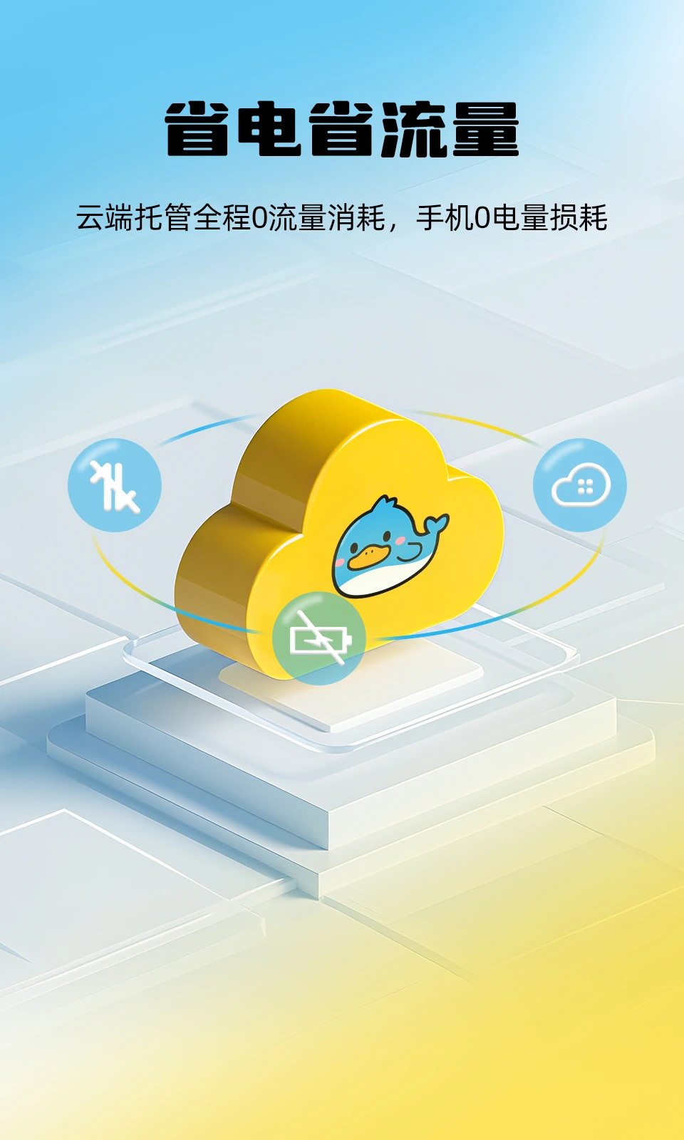 云端托管全程0流量消耗,手机0电量损耗,24小时自动挂机升级。告别发热耗电,从此游戏、生活两不误!