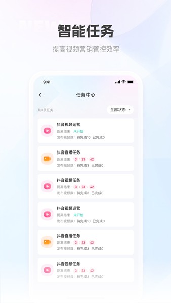 线索查找功能可以快速检索通过短视频获取的潜在客户信息,支持多种筛选条件,确保不错过任何商机。任务排行功能让团队管理者可以实时查看成员任务完成情况,激励良性竞争。内容创作功能提供专业的视频编辑工具和丰富的模板资源,即使是新手也能轻松制作出高质量的营销短视频。