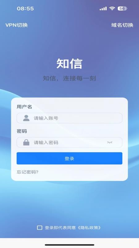 在线将知信APP下载到手机中,点击打开就能输入用户名和密码登录;首次登录后系统会引导用户完成基础设置,包括个人信息完善和常用功能配置。