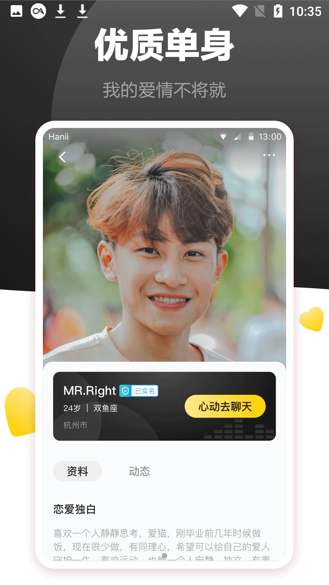 【缘分速配】一分钟大数据,为你推荐默契度99%的异性,轻松找到心仪的ta。系统会定期更新匹配结果,确保你总能遇到新鲜有趣的交友对象。【聊天交友】拓展人际关系,高颜值美女帅哥在线交友。平台提供多种聊天模式,包括文字、语音、视频等,满足不同用户的交流需求。【认证】匿名聊天,保护你个人,避免尴尬,为你交友的道路添加更多乐趣。用户可以根据自己的需求选择不同的隐私保护级别,确保交友过程安全无忧。