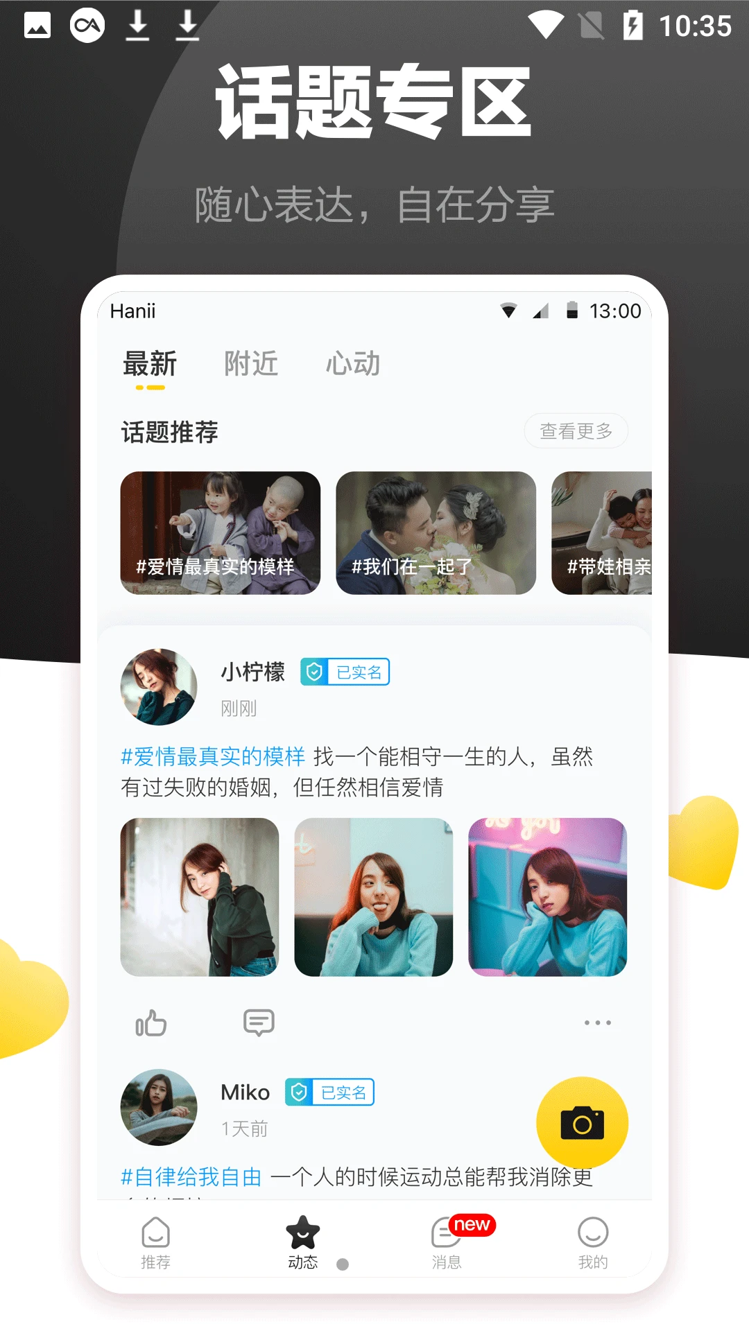 拥有全网最真实的交友,最舒适的交谈,非常的放松;平台采用严格的实名认证机制,确保每位用户的真实性,让你可以放心交友。拥有大量的话题,让双方第一次的聊天不怕尴尬;平台提供丰富的话题库和破冰游戏,帮助用户轻松开启对话。可以展示自己的才艺,分享自己的,非常的不错;用户可以通过照片墙、短视频等方式展示个人魅力,让更多人了解你的独特之处。