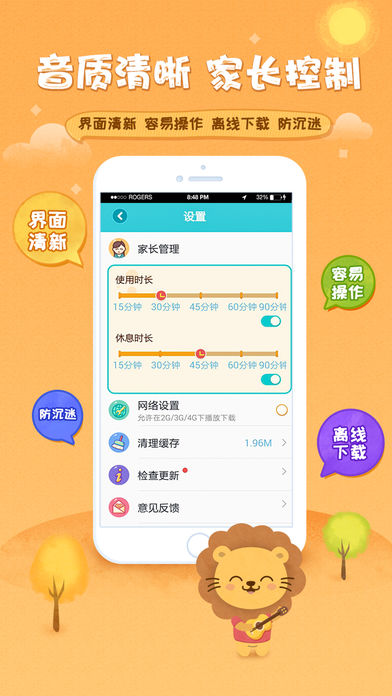 家长控制功能可以设置儿童使用时长和休息时长,有效防止孩子沉迷,保护视力健康。界面设计清新可爱,操作简单直观,即使是年幼的孩子也能轻松上手,使用体验流畅自然。下载功能支持离线使用,不局限于Wi-Fi环境,外出旅行或乘车时也能随时收听,让孩子随时随地享受学习的乐趣。