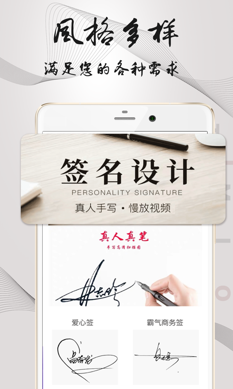 在《签名设计》中,您可以找到海量签名样式,包括艺术签名、心情签名、商务签名等多种类型,总有一款能展现您的独特个性。软件提供VIP订制服务,由中国签名设计行业协会首席设计师亲自操刀,为您量身打造专属签名。众多明星如张艺兴、李易峰、刘诗诗、吴奇隆,以及知名CEO雷军、王思聪、刘强东等都选择我们的签名设计服务。