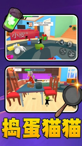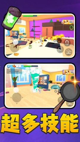 元梦小宠的最大特色在于其独特的猫咪模拟玩法。玩家可以操控猫咪在房间中自由奔跑,看到任何家具或物品都可以进行破坏,完成任务目标后还能获得丰厚奖励。游戏还加入了紧张刺激的追逐元素,当老奶奶发现猫咪的恶作剧行为时,会展开追捕。玩家需要快速点击跳跃按钮切换形态,或是躲进角落、使用技能干扰老奶奶的视线,避免被抓住。此外,游戏中的道具系统也非常丰富,玩家可以收集各种有趣的道具来解锁新技能,比如扔炸弹、加速冲刺等,让捣蛋过程更加爽快,逃跑也更加轻松。
