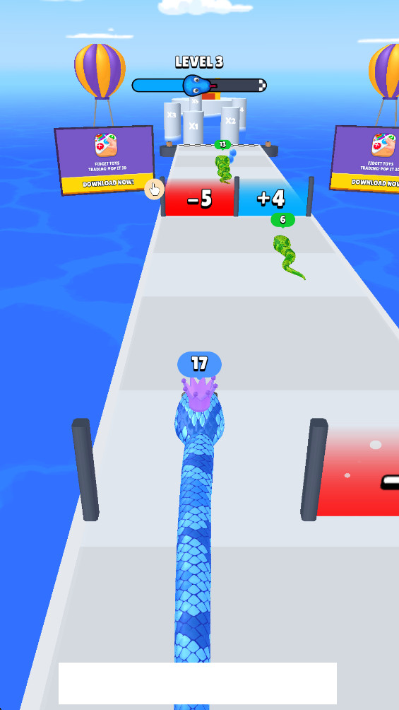 游戏中红色的蛇代表数字比你大的对手,遇到它们时要及时避开。此外,赛道上还会随机出现各种致命的陷阱和障碍物,比如突然出现的尖刺或移动的障碍。这些障碍物不仅会阻碍前进路线,还可能直接导致游戏结束,需要玩家保持高度警惕。
