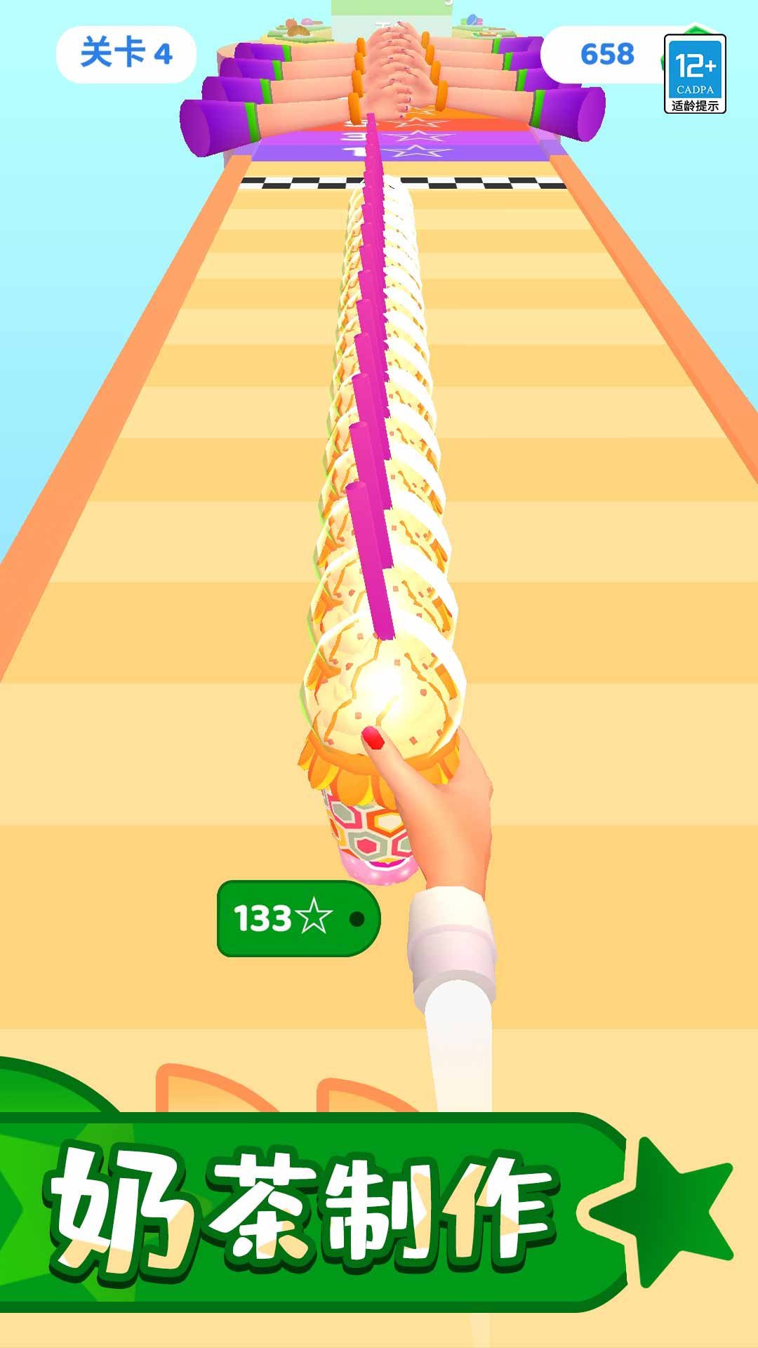 游戏操作简单直观,玩家只需通过左右滑动屏幕来控制角色移动。在奔跑过程中,你需要收集散落在赛道上的珍珠、椰果、糖浆等各种奶茶原料,同时要小心避开桌椅、行人等障碍物。每关都有特定的原料收集任务,只有集齐所有指定原料才能进入终点制作区。在制作区,你需要按照提示顺序点击按钮来完成奶茶调配,成功调配出符合要求的奶茶即可通关。随着游戏进程的推进,赛道速度会逐渐加快,障碍物也会越来越多,非常考验玩家的反应能力。同时,你还能解锁更多新配方和装饰道具,让游戏体验更加丰富多彩。