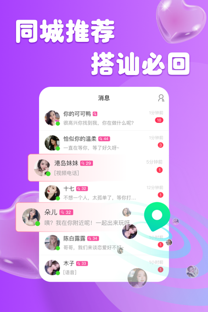 【同城约会】智能推荐系统优先展示附近优质用户,支持距离筛选和兴趣匹配,让线下约会变得简单便捷。