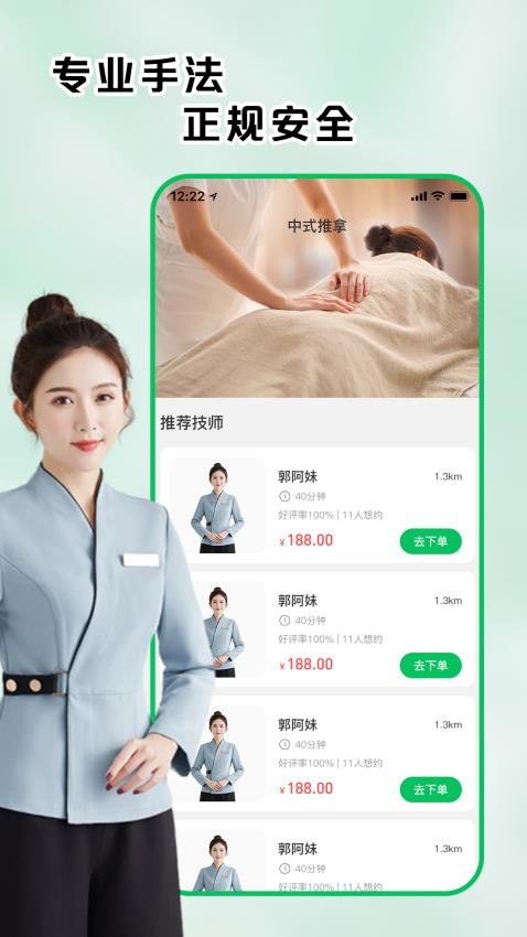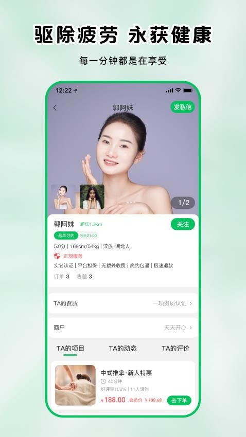 详细展示每位技师的专业资质、服务经验和用户评价,帮助用户全面了解技师情况。支持按评分、距离、价格等多维度筛选,轻松找到最适合的按摩师。