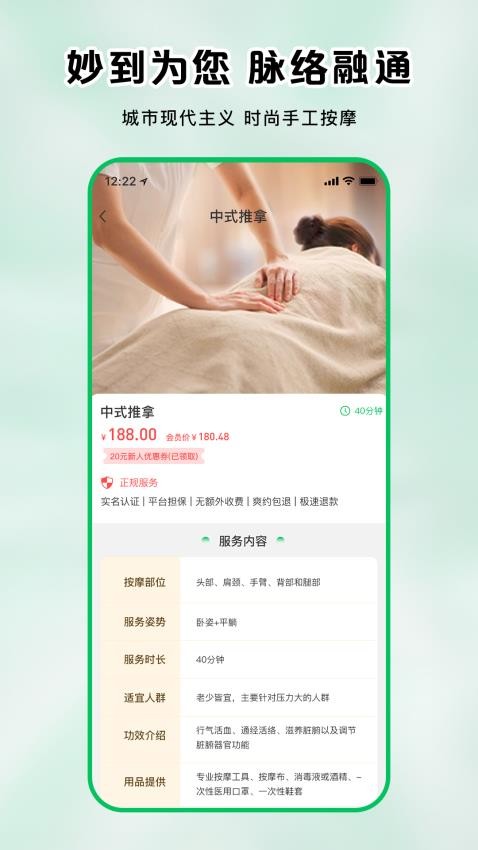 整合多种传统按摩技法资源,项目分类细致明确,方便用户快速找到所需服务;