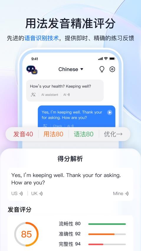 采用先进的语音识别技术分析你的发音准确度,精确到每个音节的发音质量。系统会给出专业建议,帮助你改善发音问题,让你的英语听起来更加地道自然。