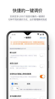 强大的一键调价功能支持至多1,000个投放对象同时调整,提供12种不同的调价方式。无论是批量上调表现优异的关键词,还是下调效果欠佳的广告组,都能一键完成,节省大量手动操作时间。