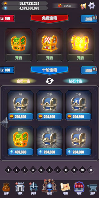 【商店】:玩家可以使用游戏内资源开启各类宝箱,获取稀有装备和材料。商店会定时刷新免费宝箱,VIP玩家还能享受额外折扣和专属商品,是快速提升战力的重要途径。