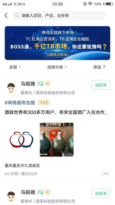 现在流行做生意跟老板谈!BOSS通是为中小企业主打造的老板资源共享社区,为企业赋能!平台不仅提供各种企业服务资源,还能帮助老板建立有价值的商务关系网络。在这里,您可以轻松找到潜在客户和合作伙伴,通过法人认证展示企业形象,提升商业信任度。平台汇聚了百万级优质老板资源,覆盖全国各行业,让招商加盟、供需发布、融资找人等商业活动变得简单高效。无论是初创企业还是成熟企业,都能在这里找到适合自己的发展机会。