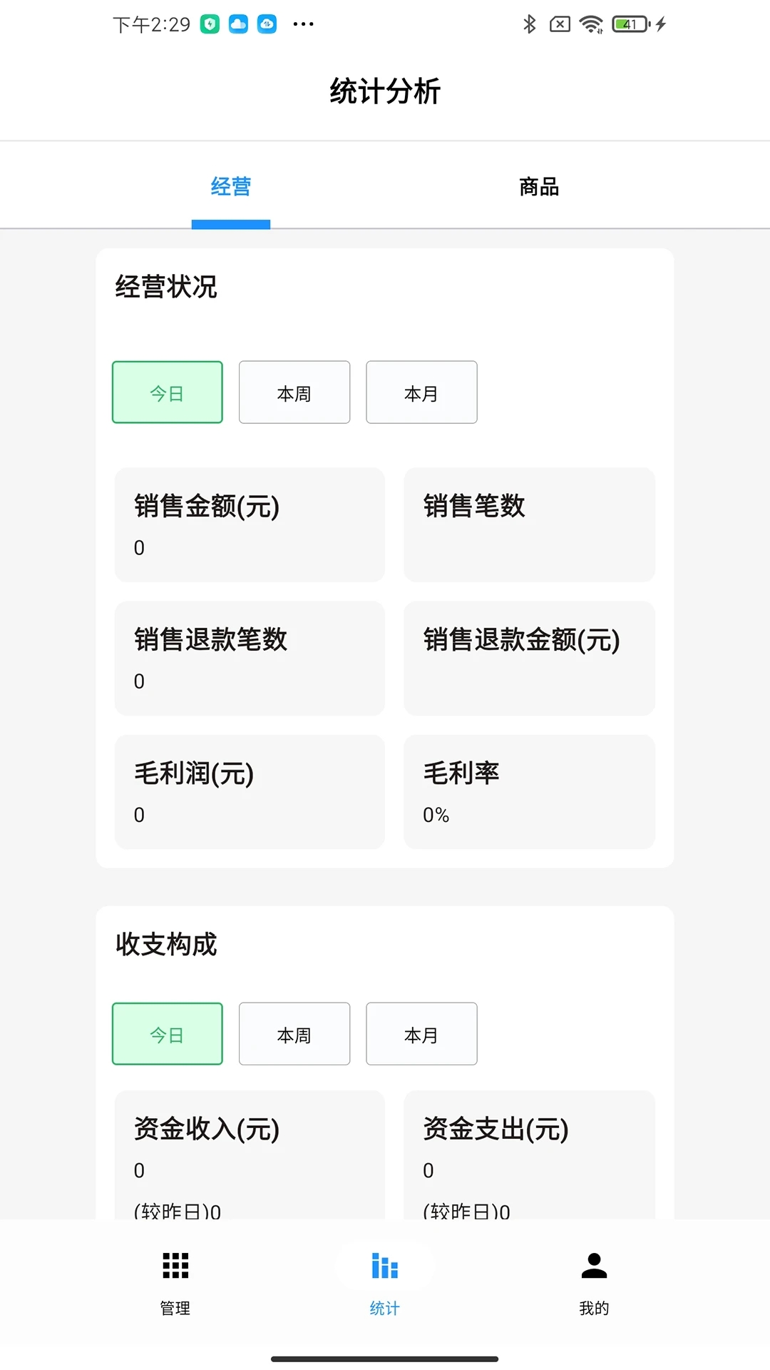 底部导航栏的【统计】功能模块提供强大的数据分析能力,不仅可以管理门店运营数据,还能自动生成直观的图表报表。这些数据支持导出分享,方便商户进行经营决策。