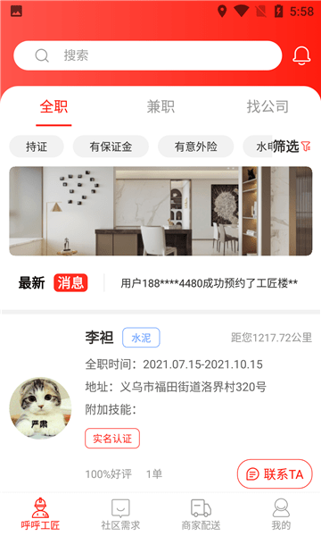 平台整合了装修、维修、家政等12大服务领域,200+细分工种的专业人才库。通过智能分类系统,用户可精准筛选具备特定资质认证的服务者,如持证水电工、设计师等。系统还支持按服务评分、接单量等维度排序,确保用户获得最优服务选择。