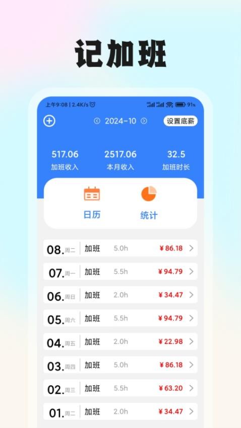 软件内置智能工资计算器,用户只需设置时薪,系统便会根据工时自动生成工资明细。工资计算功能支持多种薪资模式,满足不同用户的需求,确保工资数据准确可靠。