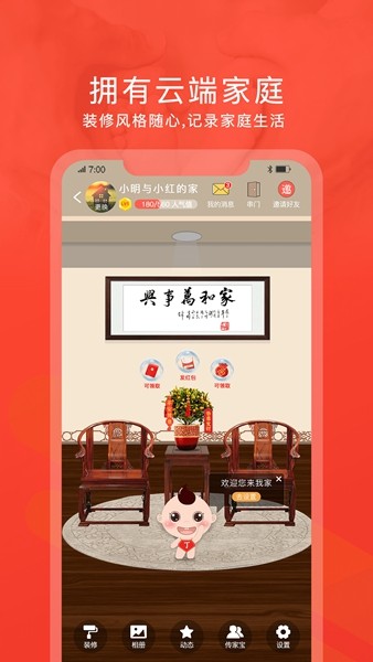 家庭功能提供多种装修风格选择,让每个家庭都能打造独特的虚拟空间。您可以记录家庭成员的生活点滴,系统会自动生成精美的相册和影集。独特的红包互动功能让家人间的交流充满惊喜,让亲情在数字空间中得到升华。